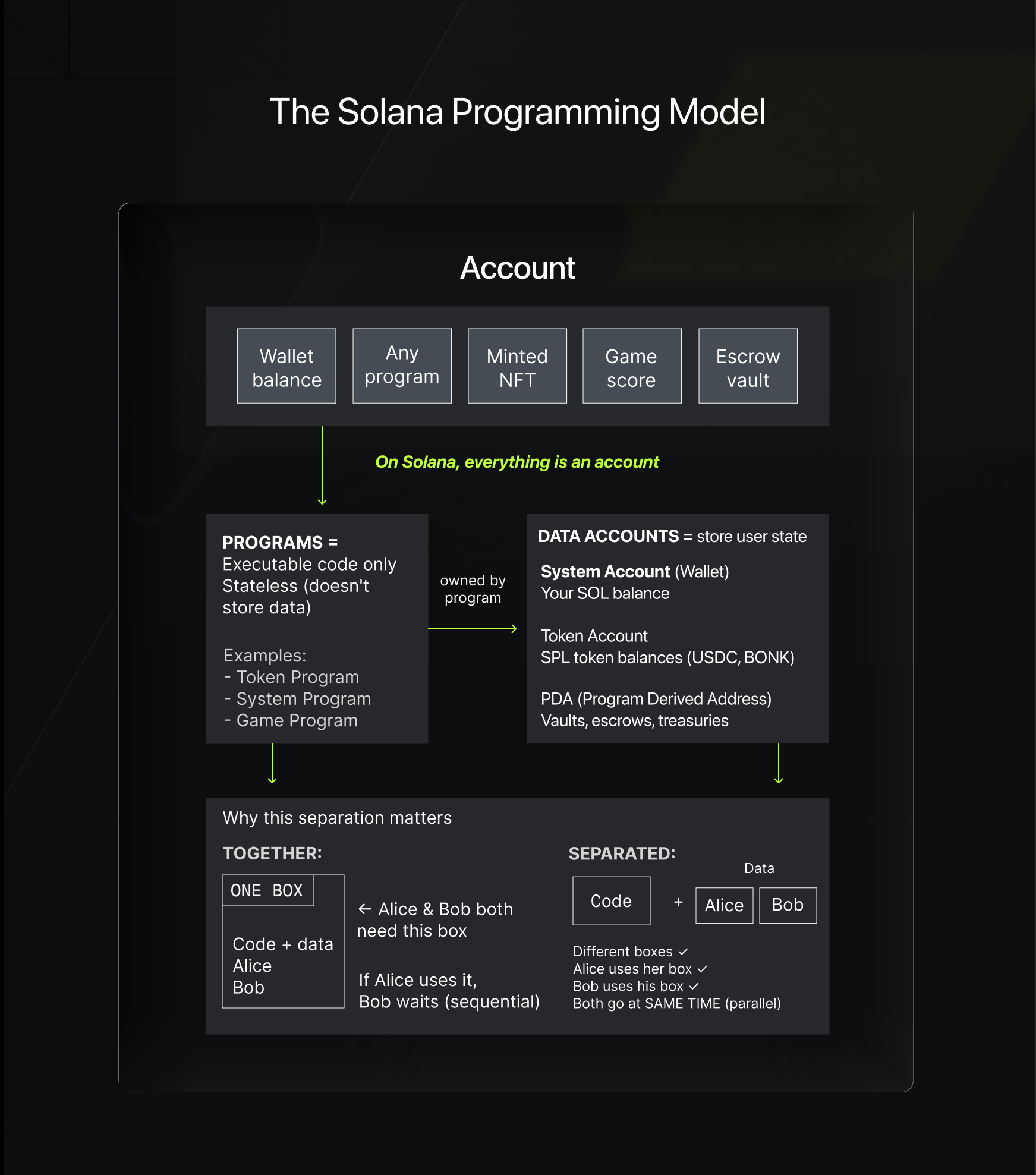This is the technical reason for the separation we discussed earlier: programs process, accounts store. This division enables parallel execution.