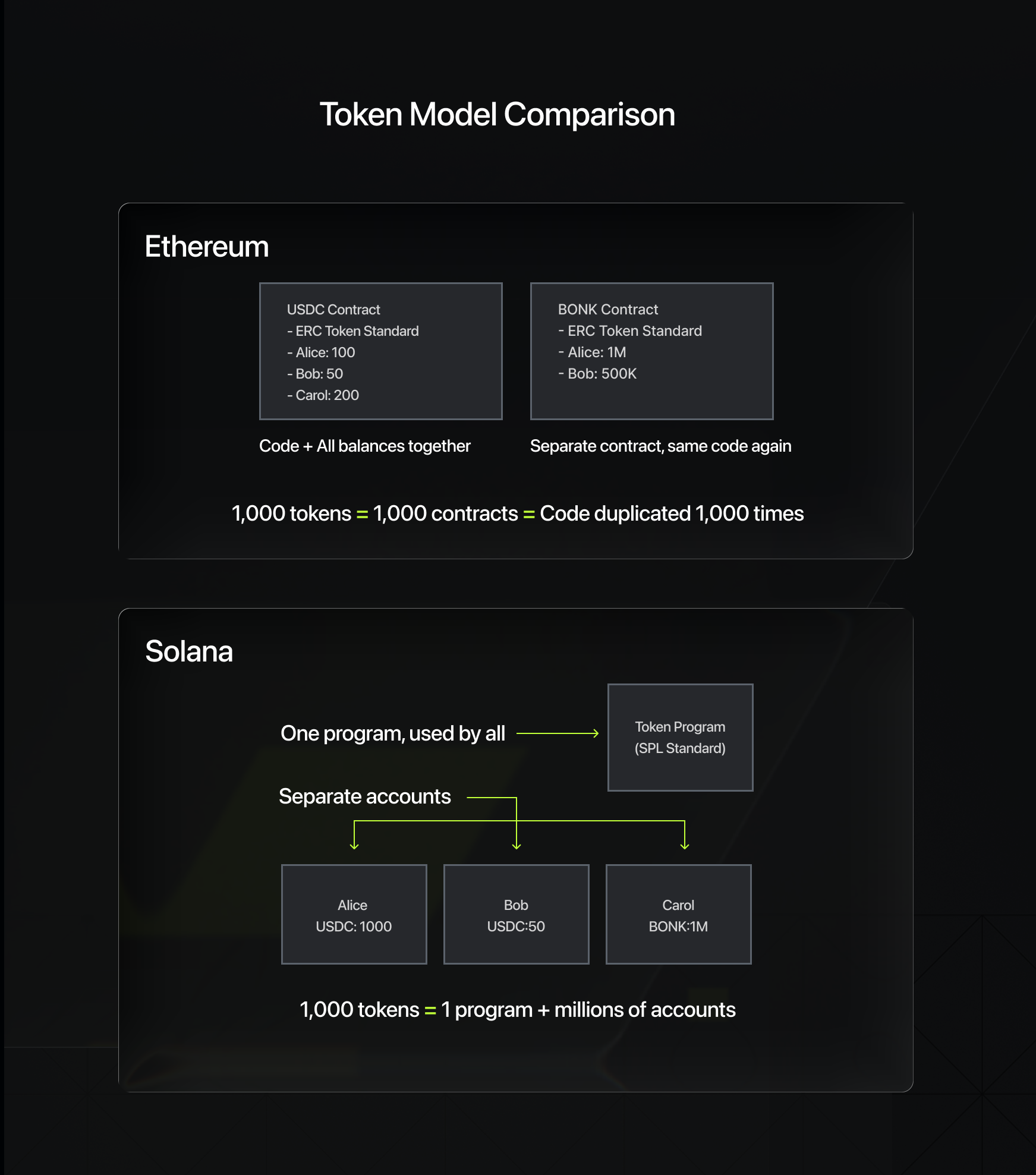 One Token Program serves every SPL token on Solana, millions of tokens, and one set of rules. It's like installing Excel once for many spreadsheets versus installing Excel separately for each spreadsheet.