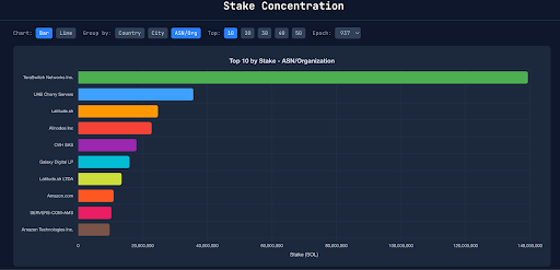 As a result, most operators don't buy servers outright, they rent them from professional data center providers. The market consolidation: in Epoch 936, TeraSwitch Networks alone hosted roughly 34% of total staked SOL, followed by Cherry Servers (~8.7%), Latitude.sh (~5.7%), Allnodes (~5.5%), and OVH (~4.4%).