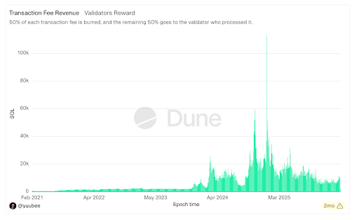 - Late 2024 & early 2025: As on-chain activity surged, fee revenue spiked dramatically. Some epochs saw fees approach or exceed 100,000 SOL, briefly rivaling inflation as a revenue source for the first time in Solana's history.