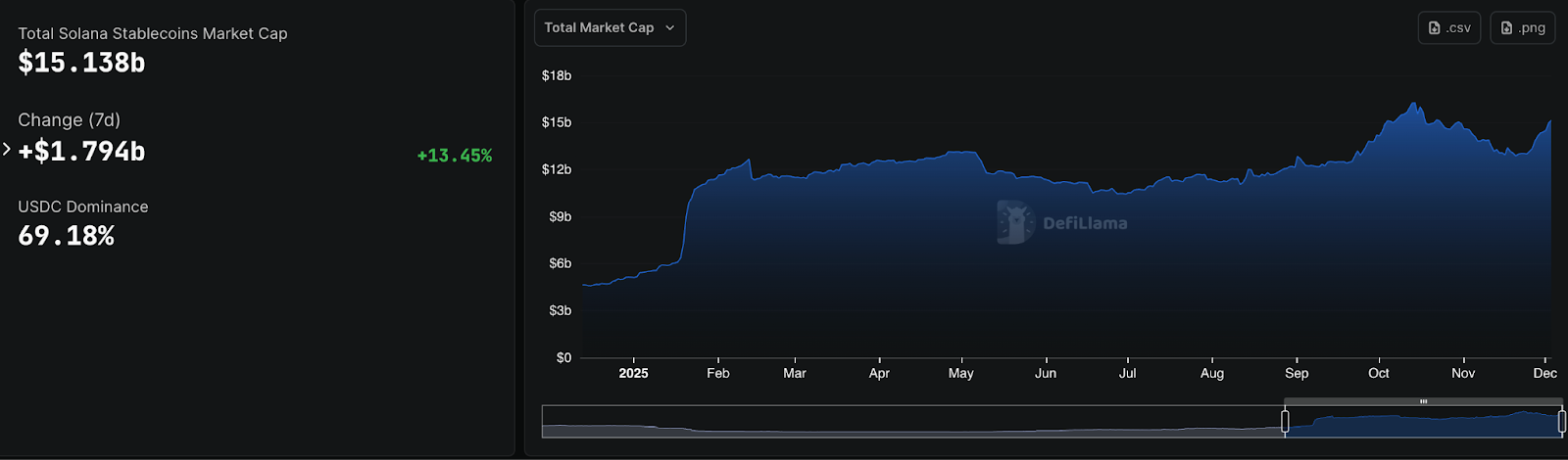Solana's stablecoin supply started 2025 at $5.10 billion. By December, it reached $15.13 billion, a 197% increase driven by real transaction velocity, not memecoins speculation.