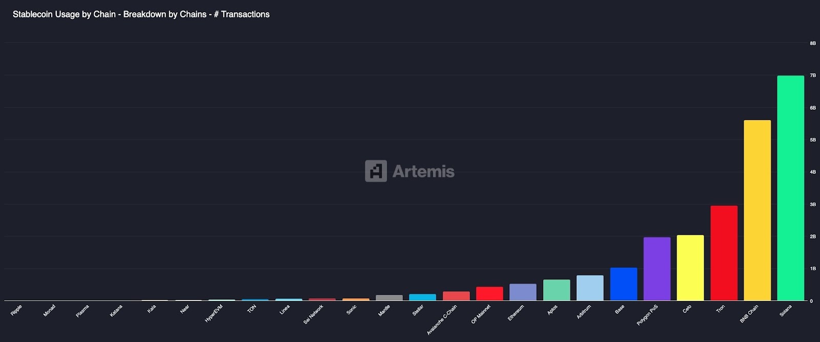 Solana processed 7 billion stablecoin transactions in 2025, more than any other blockchain. BNB Chain followed at 5.6 billion, Tron at 3 billion, Celo at 2 billion, and Polygon PoS at 1.9 billion. That's 25% more than the second-place network, outpacing chains with far larger retail user bases.