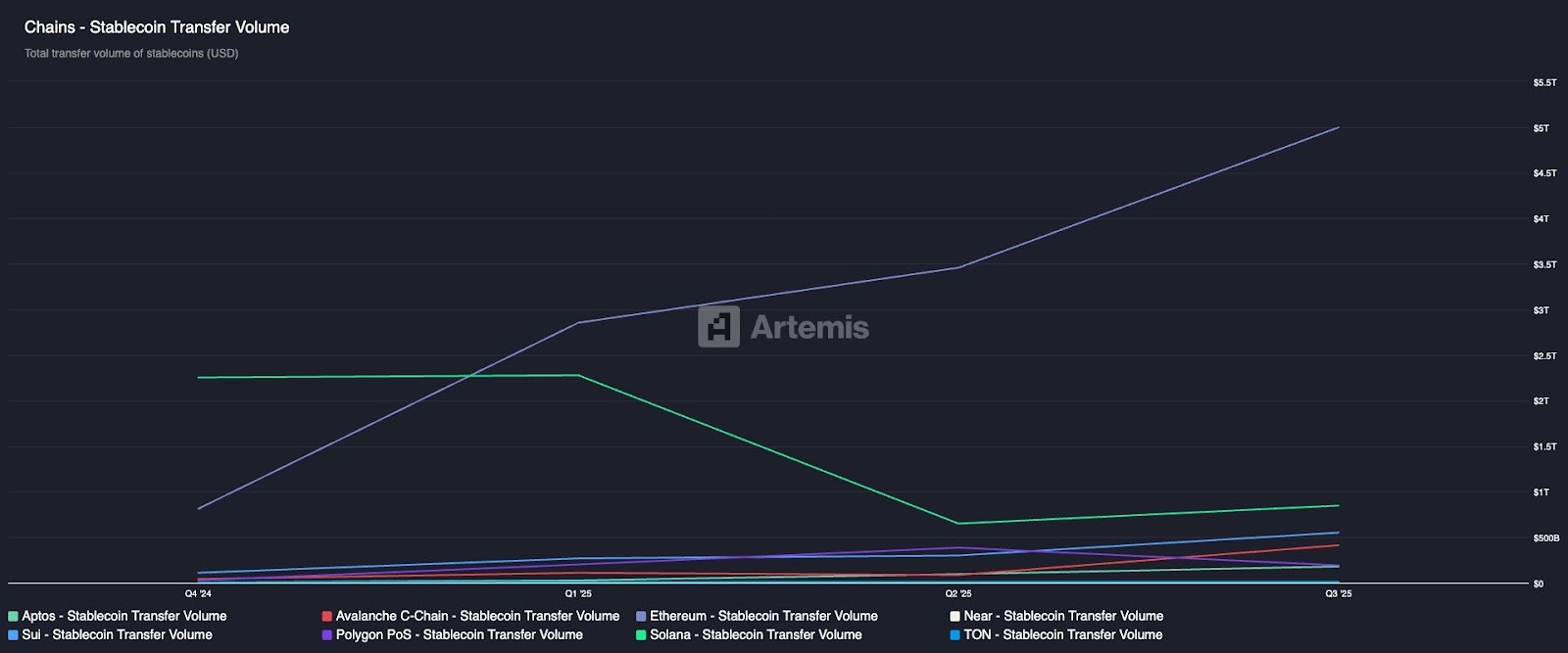 The momentum continued throughout the year. In Q1 alone, Solana processed $2.3 trillion in stablecoin transfer volume, 79% of Ethereum's $2.9 trillion, demonstrating the network's capacity for high-velocity settlement. Solana maintained its #2 ranking in stablecoin transfer volume across all three quarters of 2025, processing institutional-scale flows with sub-second finality and near-zero fees.