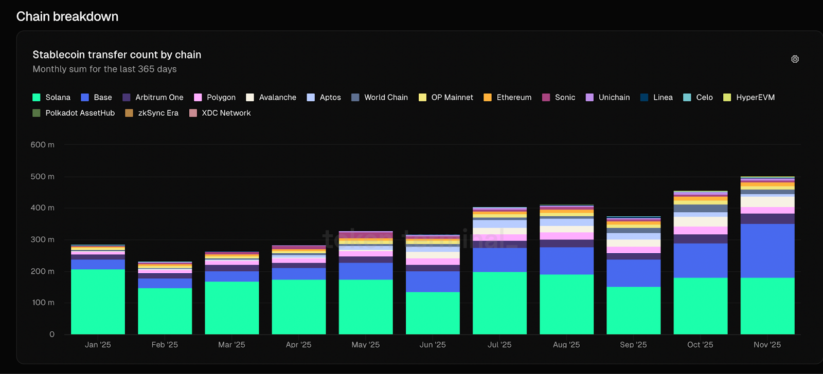 Solana dominated USDC transfer activity every quarter: 522.8M in Q1, 483.3M in Q2, and 543.4M in Q3, far ahead of Base (247.3M peak) and Ethereum (29.6M peak). By mid-2025, Solana processed nearly 50% of all USDC transfers globally, consistently handling 5-30x more transfers than other major chains.